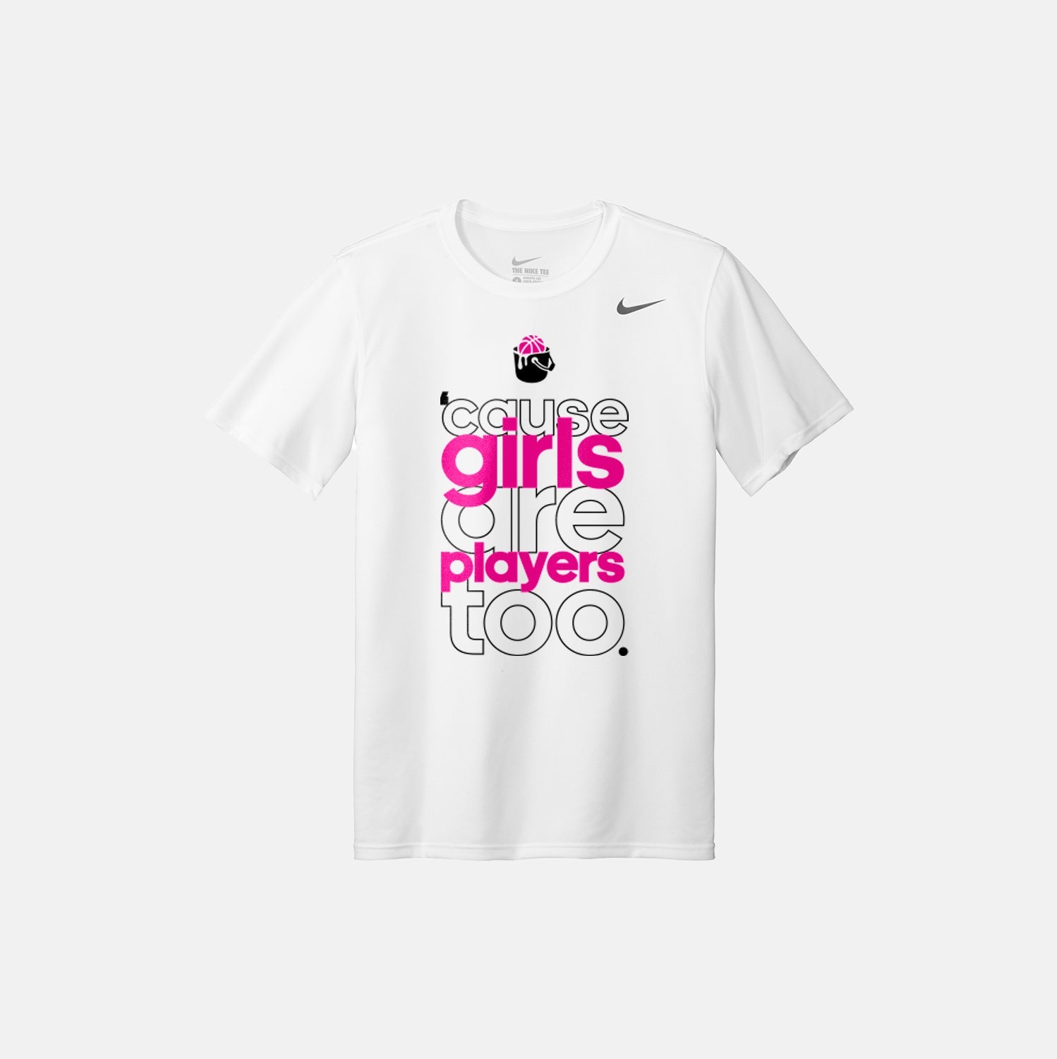 White short sleeve tee with Bucket Get(Her) classic pink and white wordmark text 'cause girls are players too' and a Bucket Get(Her) small core logo.