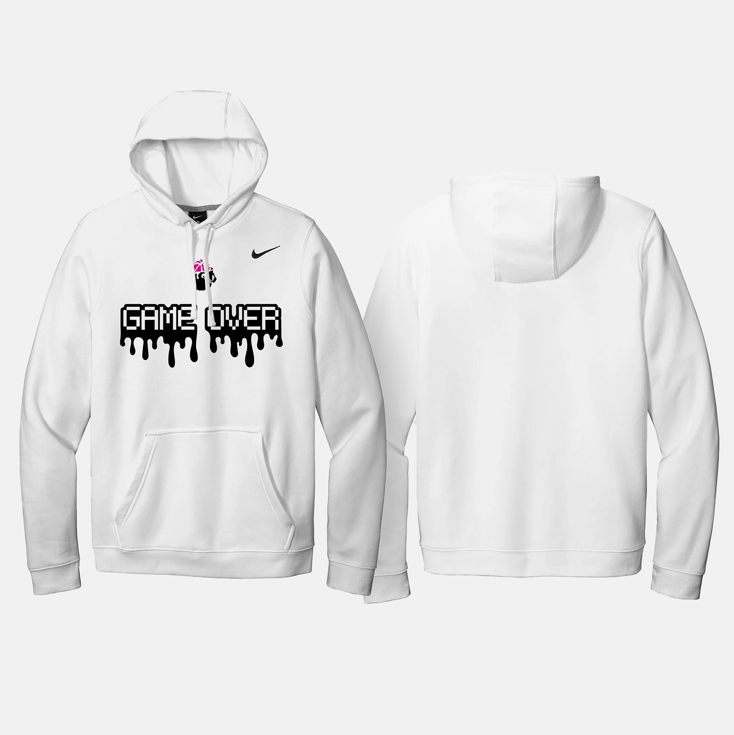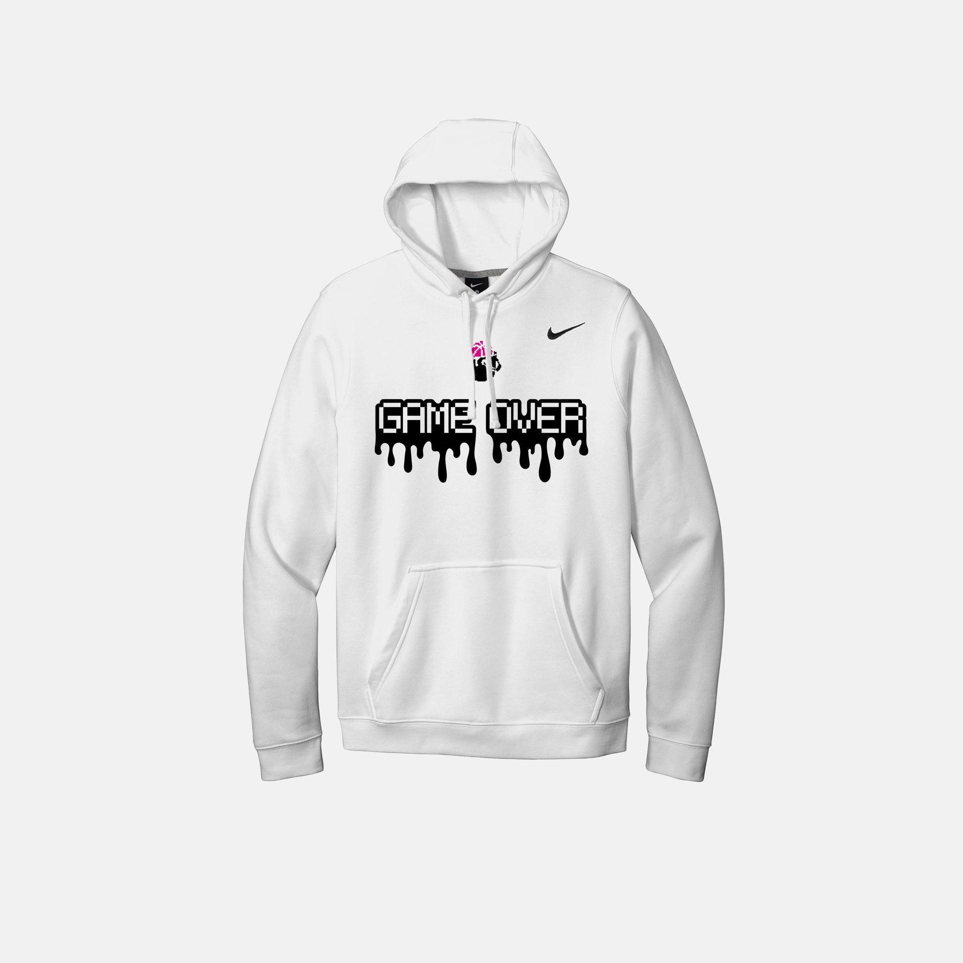 Super comfortable drawstring hoodie with Bucket Get(Her) small core logo above a retro wordmark GAME OVER with paint drip.